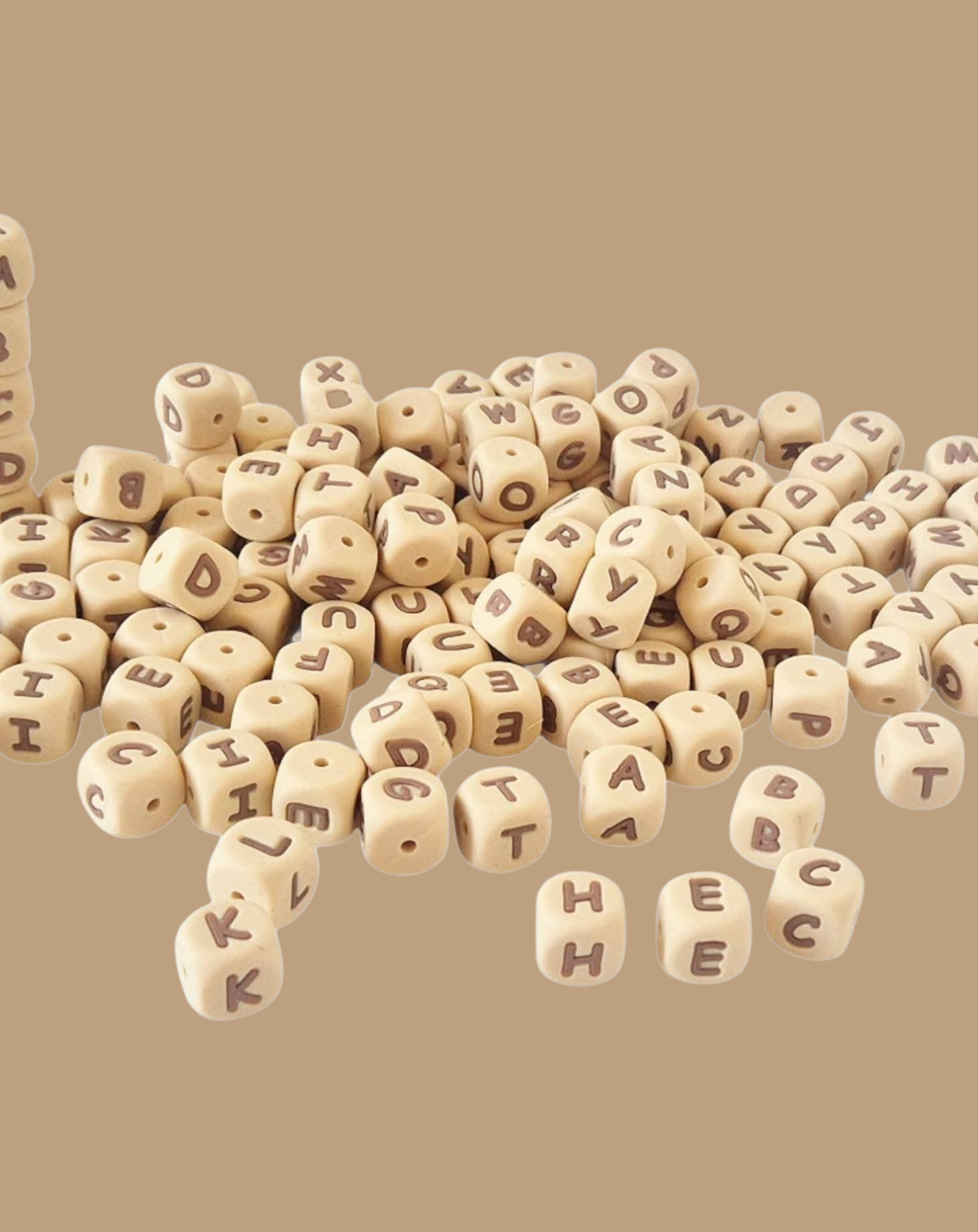 Perle cube en silicone bord arrondi coloris : Beige - Noisette lettres de l'alphabet de A à Z , dimension 12x12mm trou env. 2mm vendu à l'unité