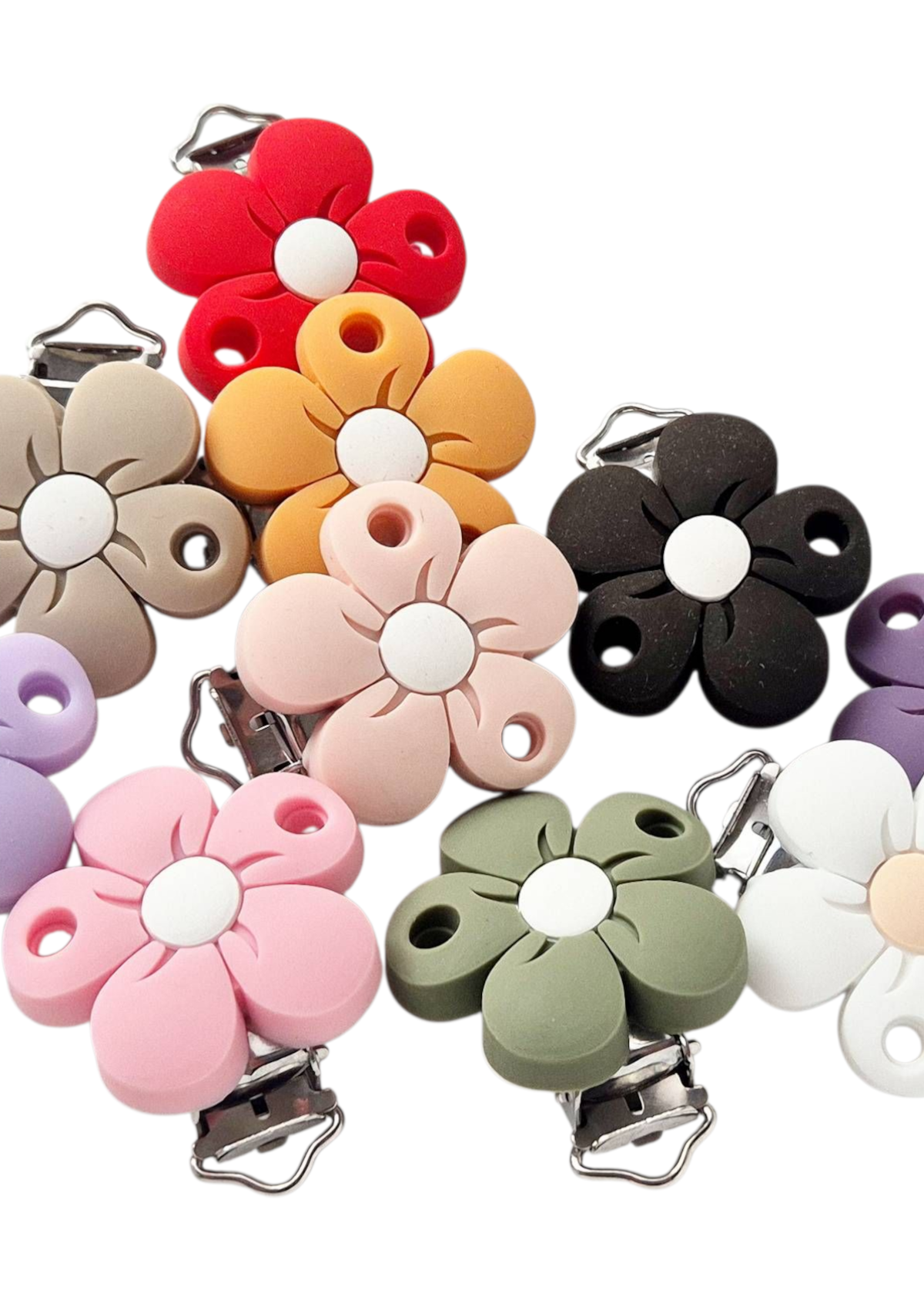 Clip en forme de marguerite en silicone Diamètre : 35mm Épaisseur : 10mm 2 trous de ventilation Plusieurs coloris disponible Vendu à l'unité